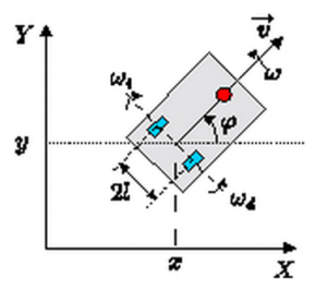 El robot móvil bajo estudio es un vehículo que tiene dos llantas traseras, izquierda y derecha, idénticas que son paralelas entre sí, no deformables y unidas por un eje. Además, usa un punto de apoyo frontal omnidireccional que asegura que la plataforma del robot se encuentre sobre un plano. Suponiendo que el movimiento se lleva a cabo sobre el plano XY y que las llantas ruedan sin deslizarse, en la literatura existente se encuentra que las ecuaciones que describen la cinemática del móvil están dadas por Sira y Agrawal, 2004[1] .