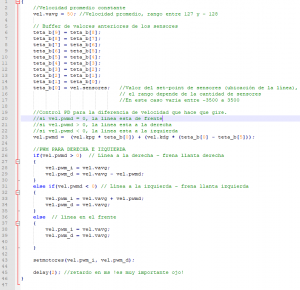 La entrada del sistema es la lectura de los sensores el cual dará el set-point a seguir. A continuación se presenta el algoritmo del PD implementado. Este es un código de ejemplo y funciona para todos los velocistas o seguidores de línea.
