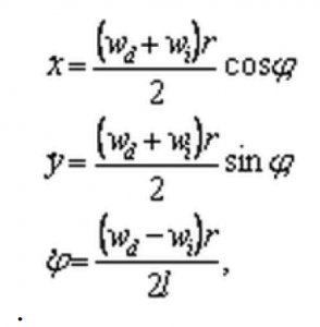 Donde (x, y) denota la posición del punto medio del eje que une las dos llantas traseras, φ es el ángulo que forma el eje de simetría del móvil respecto al eje X positivo, wi y wd son las velocidades angulares de las llantas izquierda y derecha, respectivamente, mientras que r es el radio de las llantas y 2l es la separación entre ellas, para mayor claridad véase la Figura 4. En estas ecuaciones, y en lo que resta del trabajo, la derivada con respecto al tiempo, t, se denota por un punto.